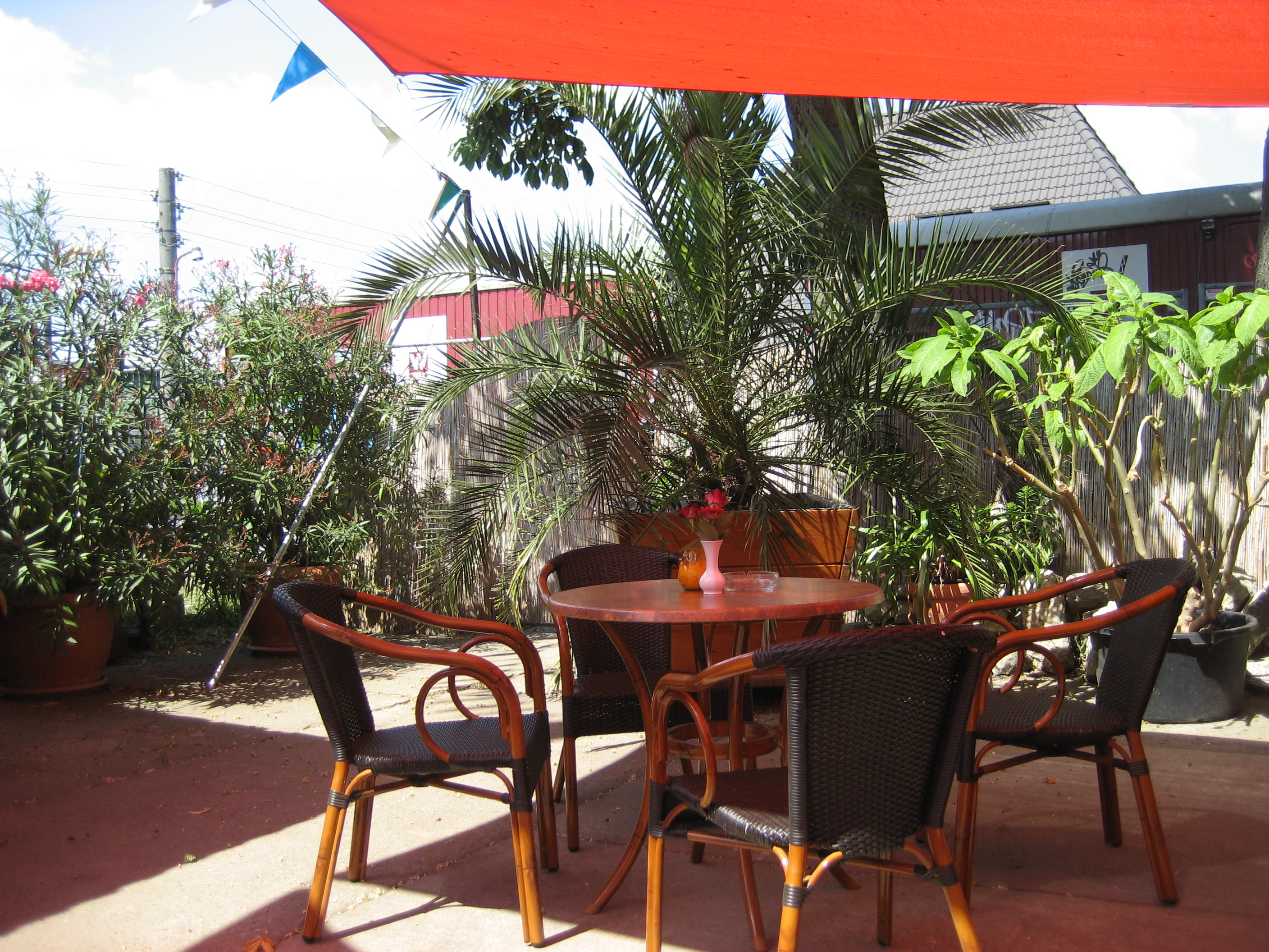 Genießen Sie Ihre Speisen und Getränke nicht nur in unserer gemütlichen Gaststätte, sondern von Frühjahr bis Herbst auch entspannt unter Palmen!
